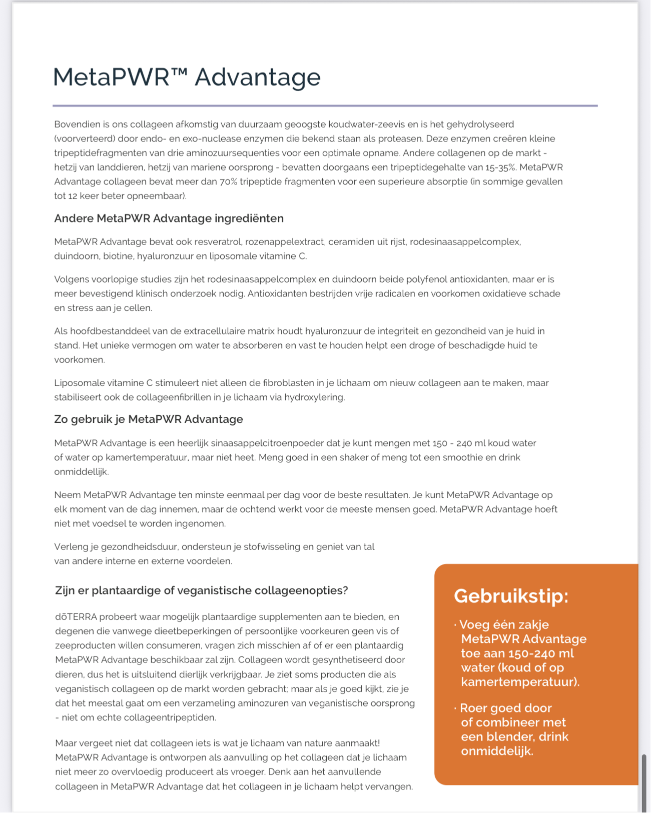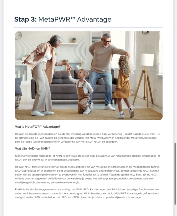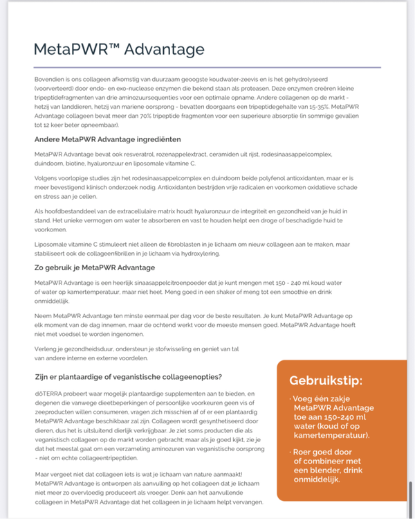 Als onze natuurlijke productie van NAD+/NADH (Nicotinamide adenine dinucleotide) en collageen na verloop van tijd afneemt, kunnen onze lichaamsfuncties niet meer optimaal functioneren. Dat is waar MetaPWR Advantage om de hoek komt kijken. Het bevat negen soorten collageentripeptiden uit mariene bronnen en NMN (Nicotinamide mononucleotide) dat kan bijdragen aan de productie van NADH en NAD+. Geleverd in een smakelijke poedervorm, neem MetaPWR Advantage om je algehele lichaamssamenstelling van binnenuit te versterken.