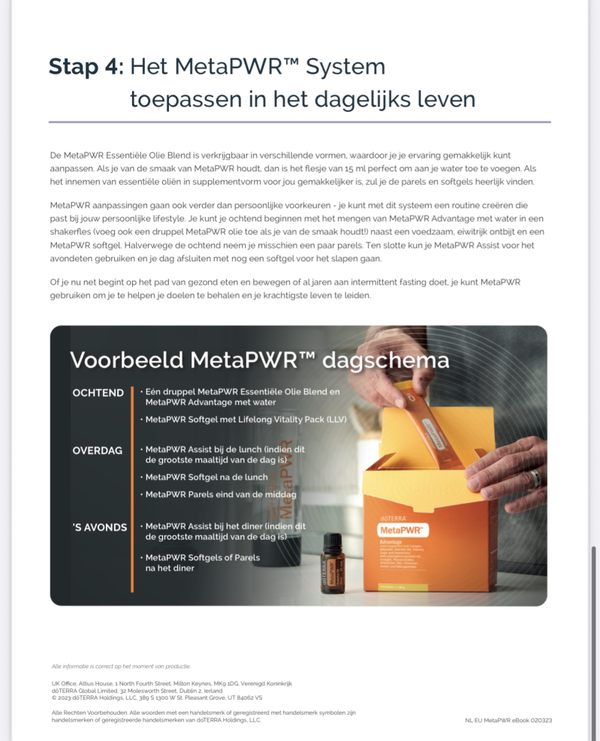 Het driestappen MetaPWR systeem van doTERRA is ontworpen om je metabole gezondheid te ondersteunen. Het bestaat uit het gebruik van de MetaPWR essentiële olieblend, MetaPWR Assist en MetaPWR Advantage op een dagelijkse basis.